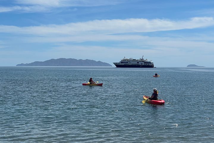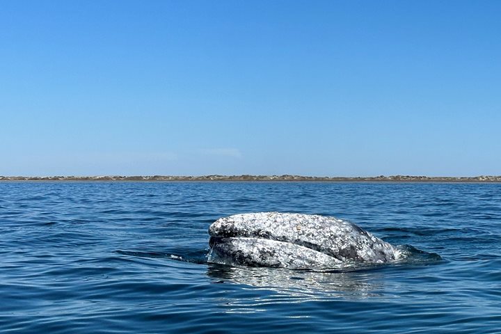 Today, we woke to an absolutely incredible sunrise as we anchored at Isla Santa Margarita. After breakfast, we boarded pangas and rode to Bahia Almejas with the sun shining on our smiling faces. It was not long before we saw the telltale heart-shaped blows of gray whales. Whales quickly surrounded us on all sides, showing off for one another. We were in a mating area, so it was common to see spyhopping, breaching, and breathtaking clusters of whales. We were treated to a friendly visitor today, as one whale came right over to us. The whale spent about 45 minutes with us, allowing guests in each panga to pet its face. This is such a rare treat, one burned in our memories forever. As this close encounter with such a gentle animal unfolded, shouts of joy were heard.