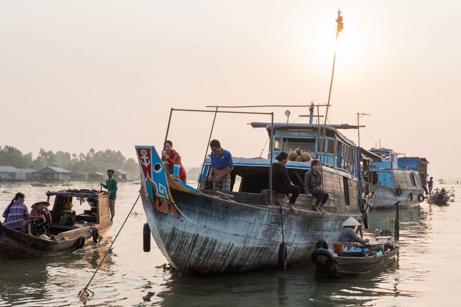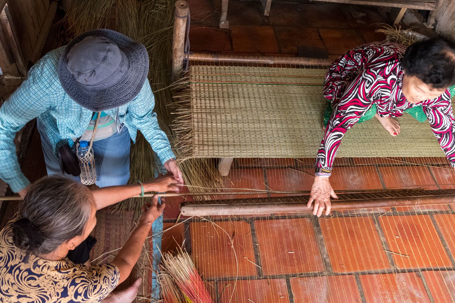 After lunch on Jahan, we take a 40 minute boat ride through narrow channels to explore Binh Thanh Island at Sadec. On the way, we see fascinating views of river life and it serves as a wonderful experience to understand the Vietnamese way of life and culture. When we get to shore, where we meet a pair of charming seniors at the local temple. The man and woman tell as their life stories and hardships as well as details about the community. The island has a kindergarten, elementary, and secondary school, but students will have to leave Binh Thanh Island if they want to attend high school. Most villagers, as far as we can see, are occupied with the weaving of sage grass mats, which involves two people. Sage grass has a very distinct fragrant smell. Some of our group try to weave the mats. Yikes – slow motion.