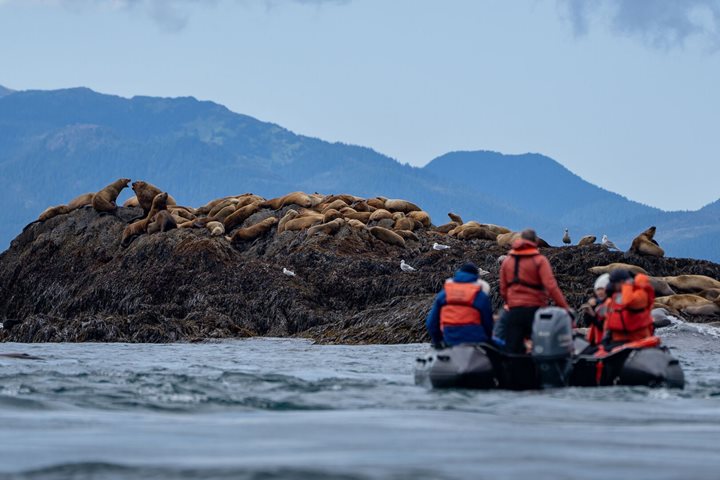 We voyaged into Endicott Arm and National Geographic Sea Bird successfully navigated icebergs (and their smaller counterparts, ‘berg bits’) until we were within site of the bright blue and white Dawes Glacier. We began our morning with Zodiac tours of Endicott Arm. We cruised around in the turquoise waters of Endicott Arm, in awe of the ice-sculpture-like icebergs, the Dawes Glacier raucously calving, and harbor seals hauled out on icebergs, many nursing their new pups. The Dawes Glacier is over 600 feet tall and approximately one mile broad and protected within the Tongass National Forest.