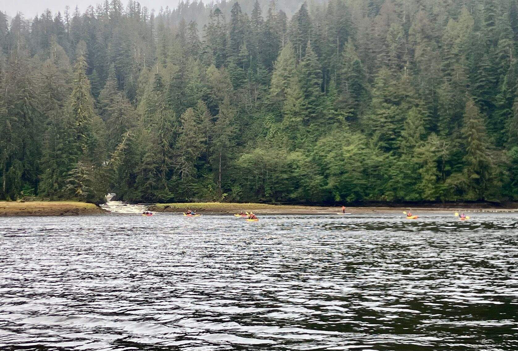 Evening recap was notably lively — naturalists shared information on fish traps, citizen science, soundscapes, and even played footage from the first dive of the trip, featuring a giant sculpin hiding beneath a magenta sea cucumber! Following dinner, naturalist Emily Mall gave a presentation on salmon, teaching us about their life cycle and offering a salient reminder that these fish are a main character within a big rainforest story. Salmon return to the same stream from which they emerged as young fry, and there, after an arduous journey past multiple barriers, they spawn, die, and fold back into the forest floor. Tomorrow, we hope to see this — to feel this — in person.