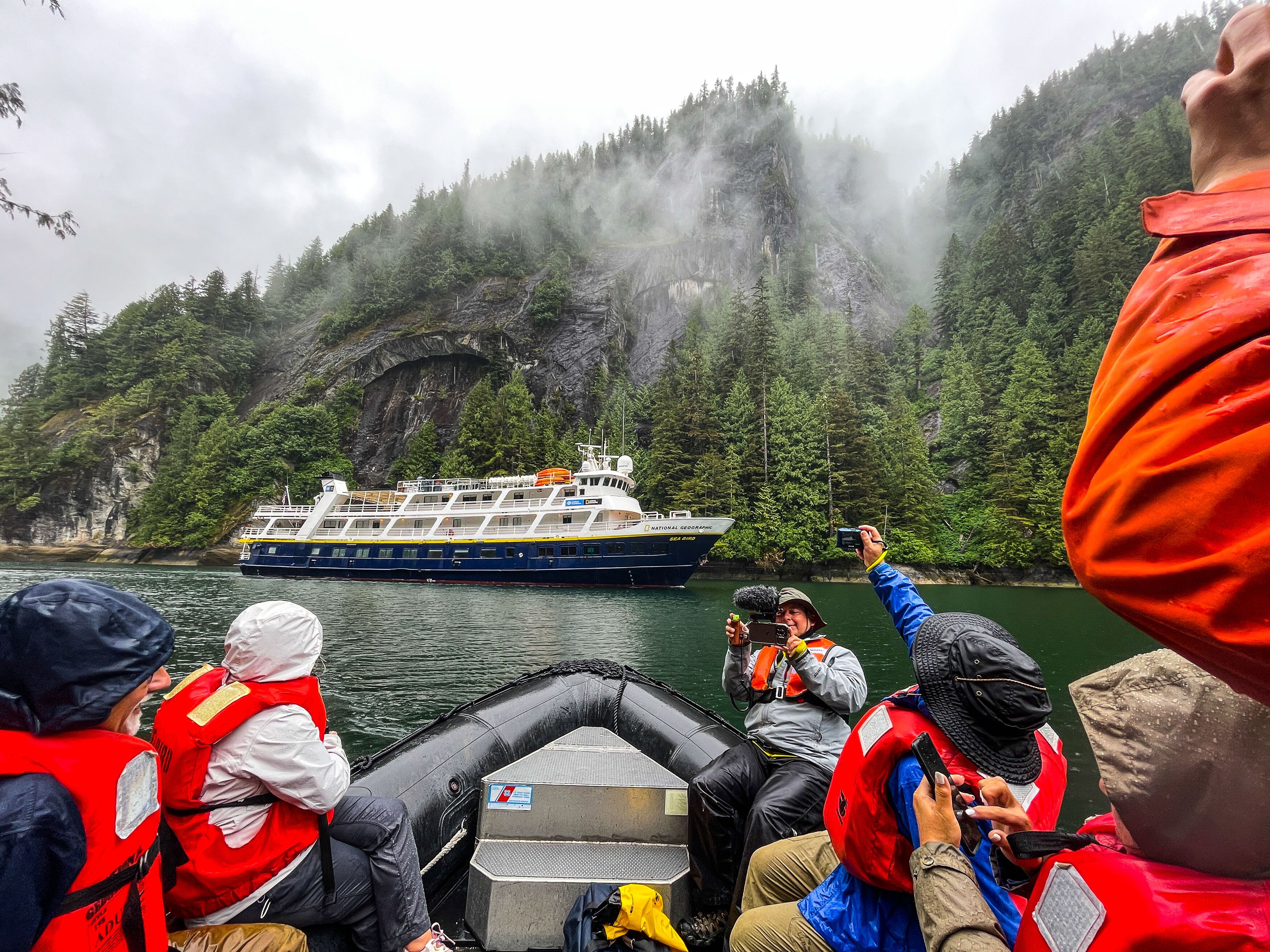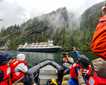 Fog enveloped National Geographic Quest in the morning at our anchorage near the Inian Islands. Each group got to join a naturalist for an exploration by Zodiac to see as much wildlife as possible in a short amount of time. Everyone took pictures and videos while observing the sea otters, sea lions, and birds. After lunch, the ship repositioned near George Island, which was utilized by the U.S. military during World War II. Some guests hiked, others kayaked, and several did some tide pooling. The grand finale was a polar plunge into the chilly Alaskan waters. It was a fantastic day on National Geographic Quest!