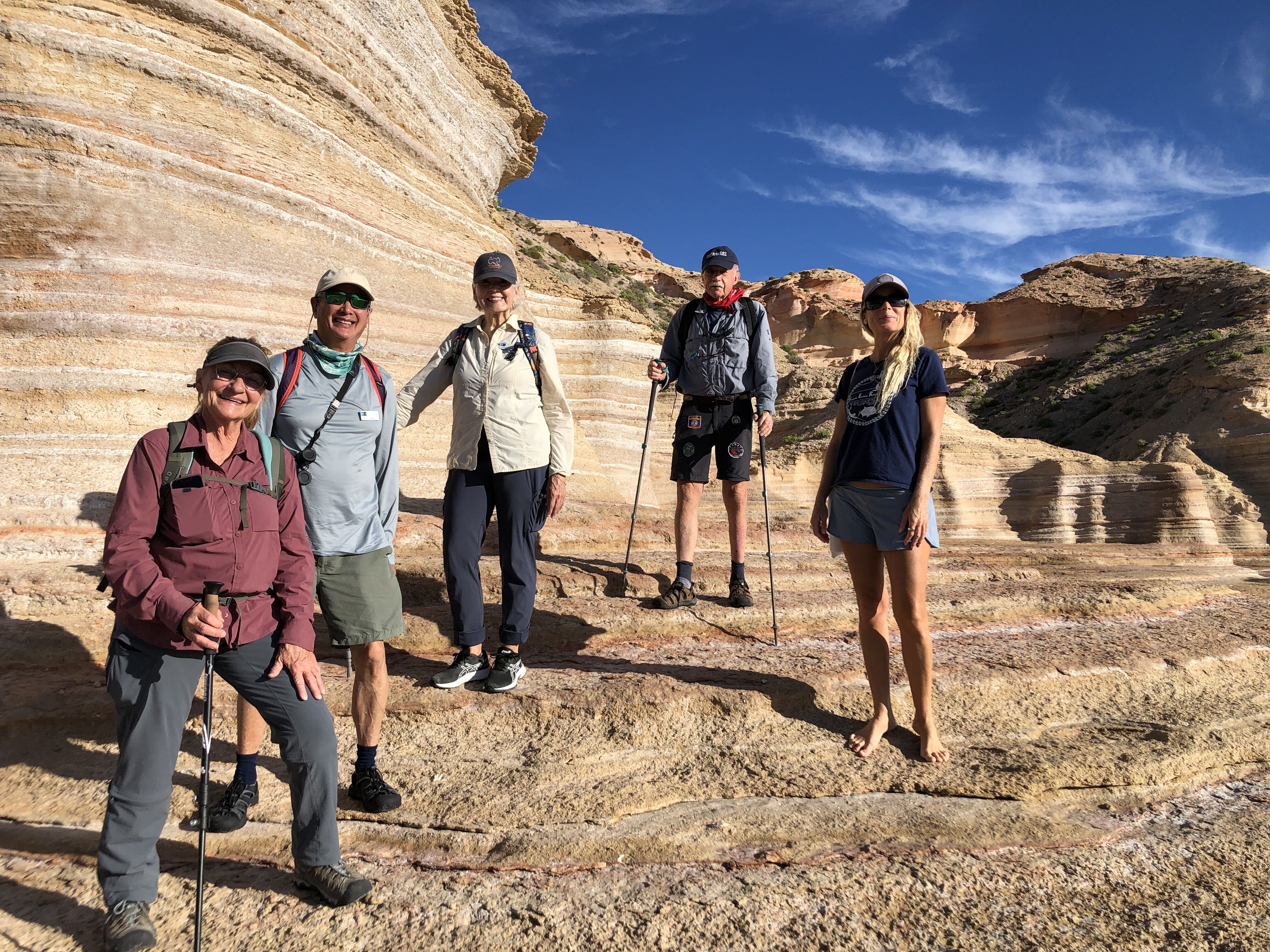 It was the last day of our twelve-day trip and we plan to make the excursions memorable. Many guests were up by dawn in stretch class or on the bow looking for wildlife. After breakfast, we visited Punta Colorada on the island of San Jose to walk up the canyon or along a sandstone bluff. The striped bluff has layers of pink sediment between layers of marine sediment laden with shells in the process of fossilization. Out on the layered promontory surrounded by water, we found a turtle fossil as well as two whale vertebras embedded in the stone. After lunch, we set up our chairs and shade canopy on a lovely beach called Puerto Gato. Surrounding us was an even deeper red striped sandstone. Guests snorkeled over a rocky reef with healthy looking corals and colorful fish. Some chose to kayak or standup paddleboard and others took their second hike of the day up the arroyo. Dinner was delicious with a spongy chocolate cake for dessert in the lounge as we viewed our collaborative slideshow. Oh, the places we’ve been! We leave tomorrow with new friends.