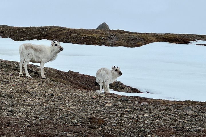 Today, the Norwegian Weather Service predicted that all of Svalbard would be covered by dense, low-lying fog. Indeed, it was a ‘fog-out’ during the early morning hours. The collective magic of guests on board National Geographic Endurance came through again, and we woke not to fog but to calm seas, no wind, and partly sunny skies. Just after breakfast, we went ashore on Edgeøya for the standard long, medium, and short hikes. At first glance, the area was stark, just a slightly undulating rocky area with no prominent features. But a closer look revealed a lush groundcover of mosses and lichens and very small plants with even smaller flowers. The reason for the small ‘lawn’ was obvious: perhaps a hundred, widely-dispersed reindeer were observed in the area, each one calmly grazing on those mosses and lichens that were a bit too high off the substrate. We walked over ancient magma split by the constant freeze-thaw of the permafrost, and we sloshed through small bogs created both by the melting active layer above the permafrost and the snow melt. By midmorning, the few clouds disappeared, and we began shedding layers. We had absolutely stunning conditions despite the dire weather conditions that were predicted (and indeed, did occur everywhere on Svalbard except where we were). This was undoubtedly due to the guests’ magic.