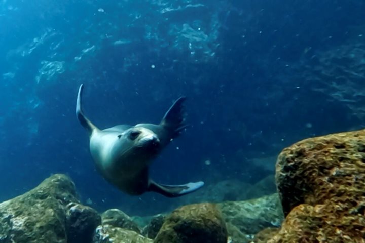 We began our morning with a wet landing on a soft sandy green beach full of sea lions. Today was gray and cooler than usual for the Galapagos. We walked nearly two miles in search of red-footed boobies, lava lizards, and mockingbirds, all unique to this island. We also witnessed a blue-footed booby mating dance. Afterward, we returned to the beach to enjoy our water activities, such as snorkeling and swimming.