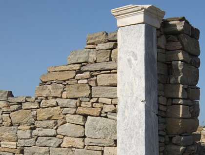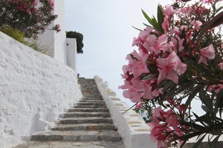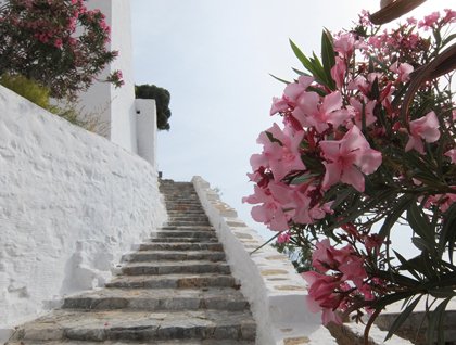 After a lunch of mezedes and local wine in the village of Pyrgos, we departed for the archaeological site of Akrotiri. Although only a small fraction of the original settlement has been excavated, finds at this site have revealed an initial settlement dating to the Neolithic period and, later, in the Middle Cycladic period, a thriving Minoan trading colony. Wealthy merchants in this 17th century B.C. city occupied two and three-story houses with interior plumbing and large windows. The interior walls were originally decorated with lively, colorful frescoes: women gathering saffron, playful monkeys, and a ceremonial procession of ships. The delicate frescoes have been removed from the site in order to preserve them, and some of these exquisite works may be viewed at the Archaeological Museum in Athens.