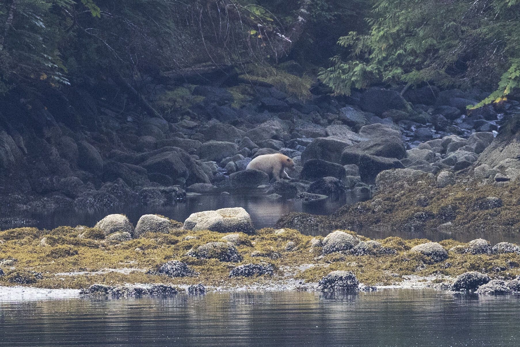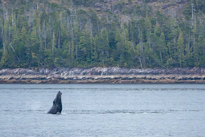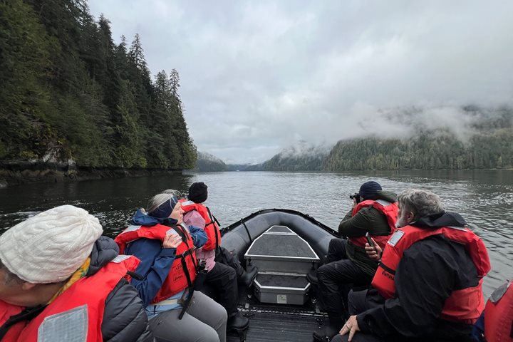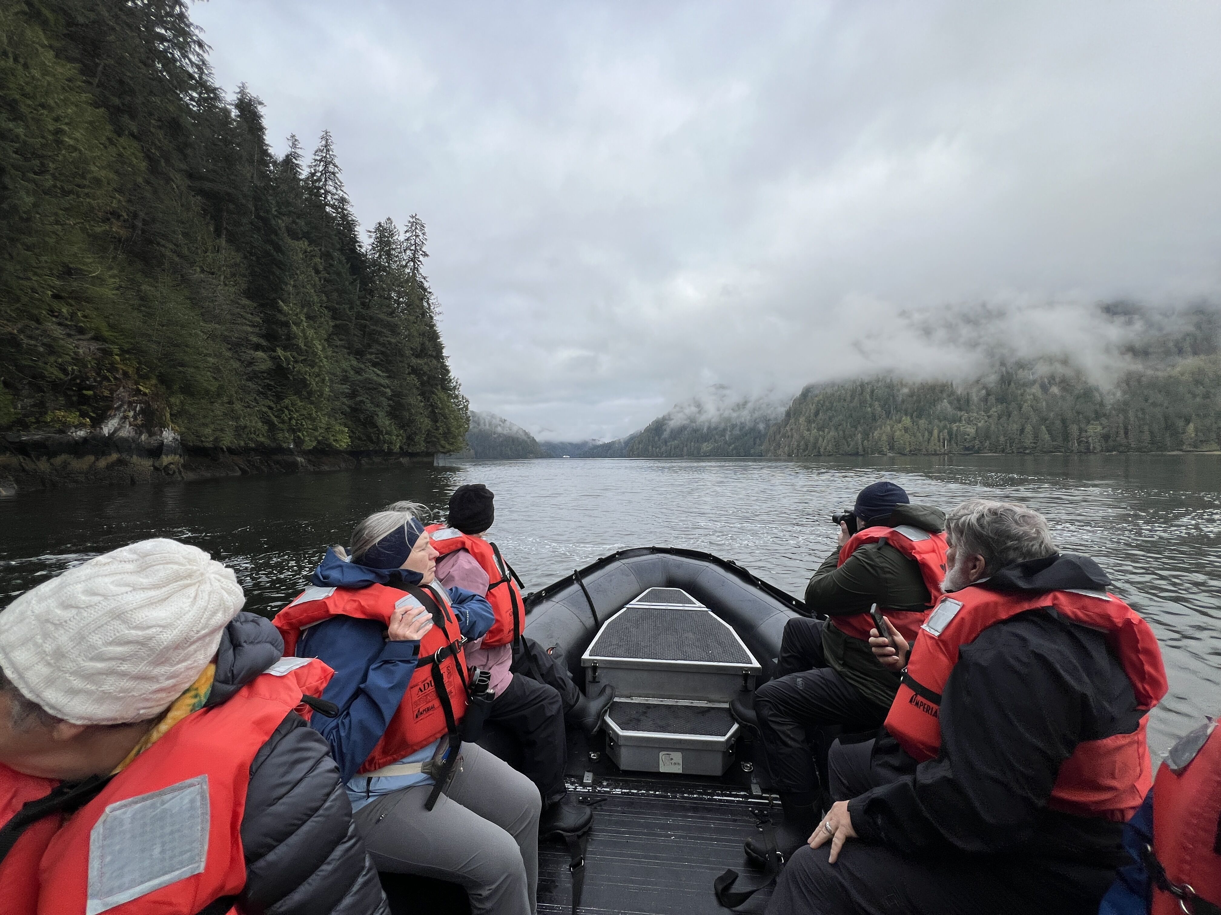 Cruising through the beautiful combined ancestral lands of the Laxyuubm Ts’msyen, Kitsumkalum, and Gitga’at Lax Yuup Peoples on board National Geographic Venture has already provided some breathtaking sights. Our morning consisted of anchoring to explore the surrounding bay and inlets from kayaks and on Zodiac cruises. Experiencing the coastline from the water allowed us to get an up-close look at wonderful intertidal organisms like the Pisaster sea star and various algae. We spent the afternoon cruising and searching for wildlife, and fortunately, we were not disappointed. At one point, it felt like the ship was surrounded by humpback whales, and a Steller sea lion was seen swimming across the bow. Of course, the iconic landscape of British Columbia’s prolific temperate rainforest was not to be outdone, and a rainbow broke through the cloudy skies. What a day aboard National Geographic Venture.